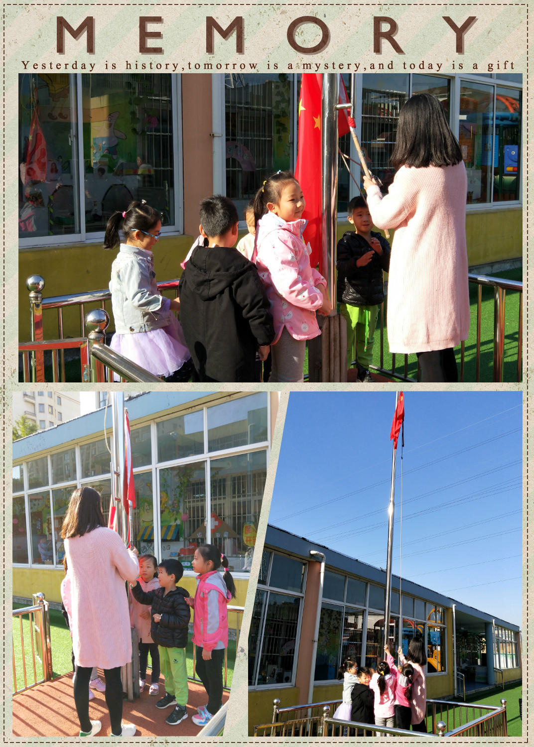 今天是2017年10月30日星期一,终于迎来了本班的第1次升旗仪式活动,早上8:40分音乐准时响起,各班孩子在老师的带领下,整齐有序的排好了队伍等待着升旗仪式的到来,此时大家看到我们大二班六名小旗手们端正地站在操场上,笑容满面,神采奕奕。升旗仪式正式开始,伴随着激昂有力的出旗乐曲,6位小旗手们护卫着国旗,步履轩昂大步向前走,神气活现,赢得了老师和小朋友们赞赏的眼光。国歌响起,升旗手有节奏的拉着升旗绳,鲜艳的五星红旗徐徐升起,全场的小朋友们伴随着乐曲唱起了国歌,歌声嘹亮,悦耳动听。